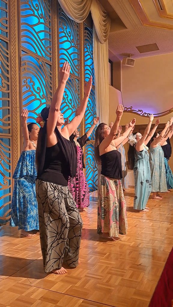 そこで先生からとてもいいアイデア!1曲を1フレーズずつソロでつなぐという名付けて「ソロリレー(仮称)」。今日メレフラで踊った曲をもう一度交代で一人ずつ。ホクレアチームはオハイアリイカルヘアとへレイカウラナ、カウルア木チームはオアフ、アレコキ。